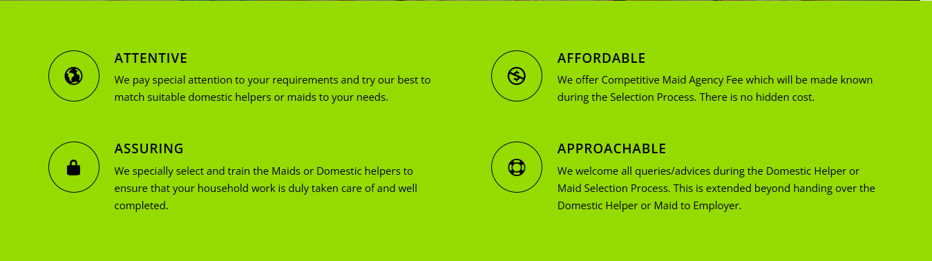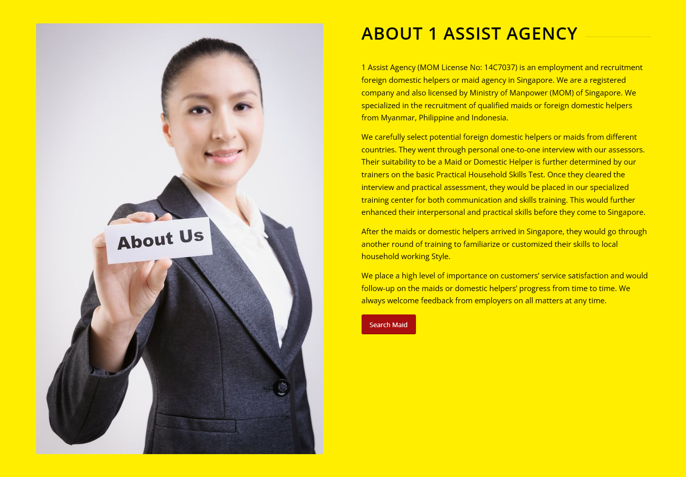 1 Assist Agency is a trusted and certified employment agency for foreign domestic helpers in Singapore. Licensed by the Ministry of Manpower (MOM) of Singapore, we specialise in recruiting and placing qualified maids from Indonesia, Myanmar, and the Philippines. We carefully choose potential foreign housekeepers from diverse countries. After their one-on-one interview with our assessors, they go through a Practical Household Skills Test to verify if they are suitable for the role of a maid or domestic helper. These candidates are sent to our specialised training centre upon passing the interview and assessment. Communication and skills training is provided to increase their practical abilities before coming to Singapore.
