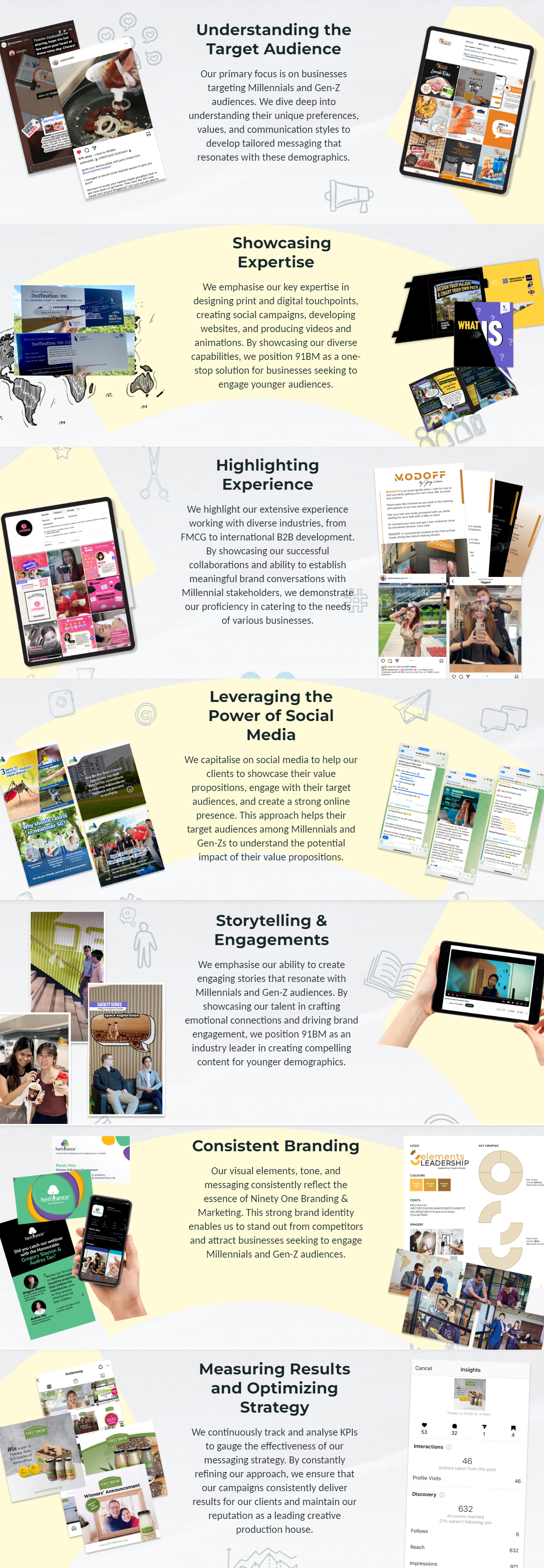 We are NinetyOne, a creative production house specialising in crafting impactful touchpoints for millennial and Gen-Z audiences. Our primary focus is on businesses targeting these demographics. We thoroughly explore their preferences, values, and communication styles to craft customised messaging that genuinely resonates. At 91BM, we highlight our core expertise in crafting print and digital touchpoints, designing social campaigns, developing websites, and producing videos and animations. By highlighting our diverse strengths, we position ourselves as the go-to solution for businesses targeting younger audiences.