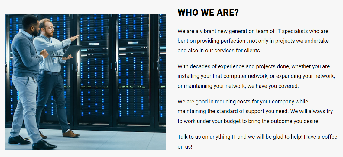 We are a dynamic team of IT specialists dedicated to delivering perfection in every project we undertake and in the services we provide to our clients. With decades of experience and numerous completed projects, we are your go-to experts for all your networking needs. Whether you're installing your first computer network, expanding an existing one, or maintaining it, we've got you covered. We excel at reducing costs for your company while maintaining the high standard of support you require. We are committed to reach your desired outcomes while staying within your budget.