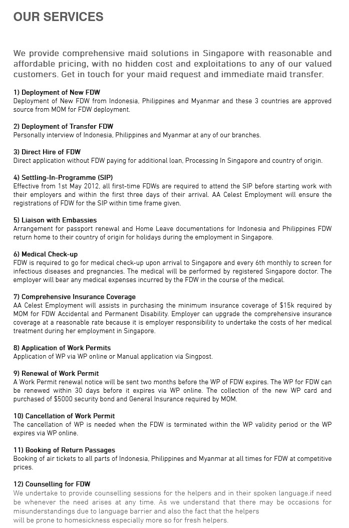AA Celest Employment is a trusted maid agency in Singapore, offering a comprehensive range of domestic helper services tailored to client needs. We specialize in sourcing domestic helpers, managing contract renewals, and handling termination processes with professionalism and care. Our core services include: