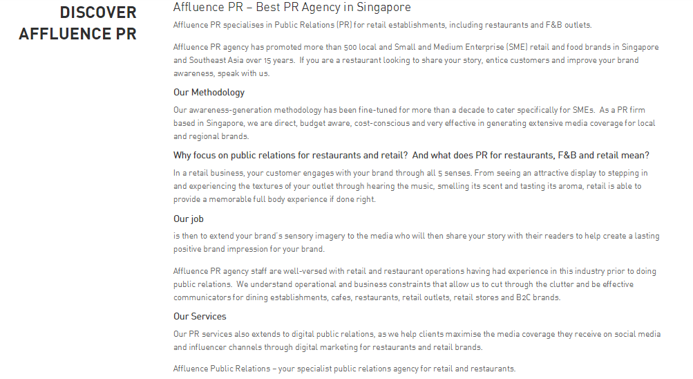 Affluence PR excels in Public Relations (PR) for retail businesses, including restaurants and food & beverage outlets. Affluence PR has promoted over five hundred local and SME retail and food brands across Singapore and Southeast Asia over the past fifteen years as a leading PR agency. Connect with us if you're a restaurant aiming to share your story, attract customers, and enhance your brand awareness. Our PR services extend to digital public relations, helping clients maximise media coverage on social media and influencer channels through targeted digital marketing for restaurants and retail brands: Affluence Public Relations – your expert agency specialising in retail and restaurant public relations.