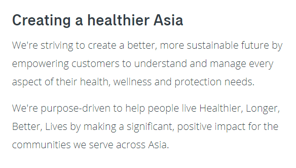 Our mission is to foster a more sustainable future by enabling customers to comprehensively understand and manage their wellness, health, and protection needs. We aim to provide tools and resources that empower individuals to make informed decisions about their health and well-being. A purpose drives us to help people lead healthier, longer, and better lives, positively impacting the communities we serve across Asia. We believe that by promoting preventive care, encouraging healthy lifestyles, and offering comprehensive insurance solutions, we can make a significant difference in the quality of life for our clients.