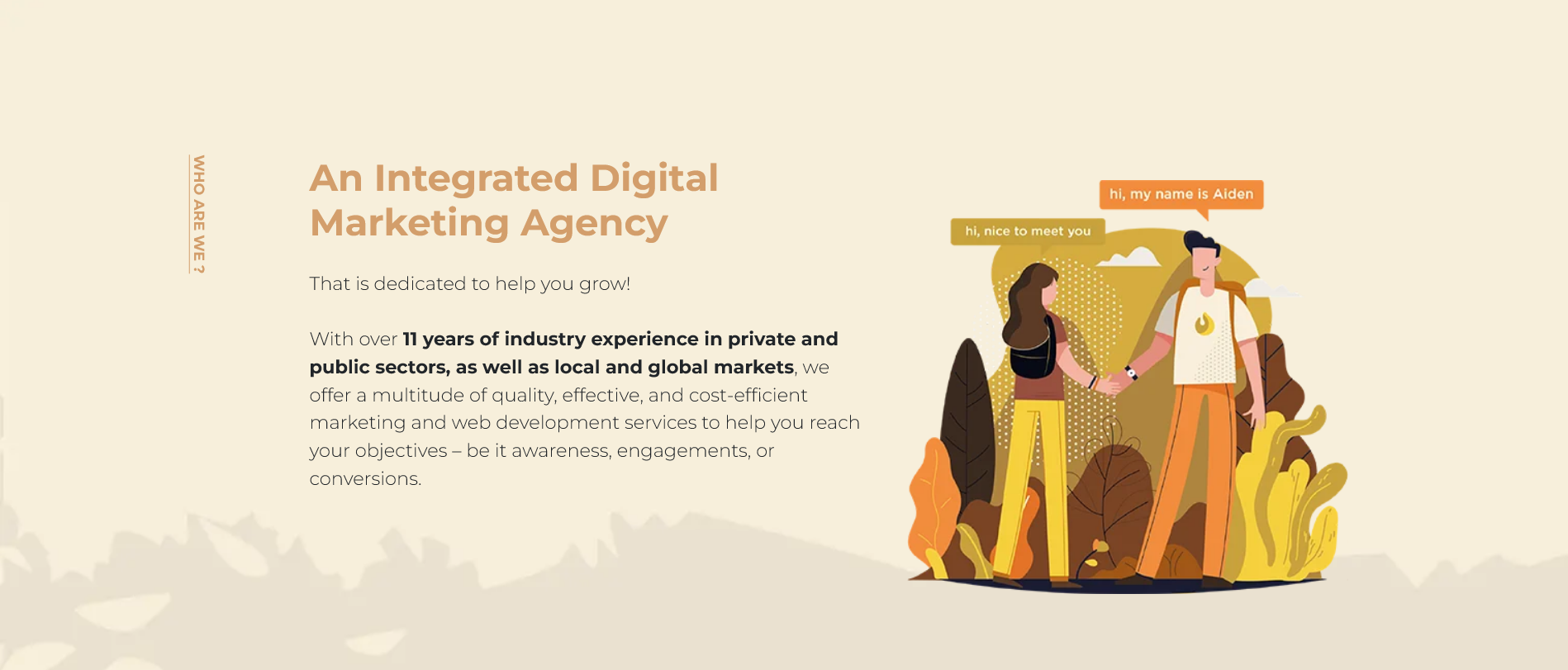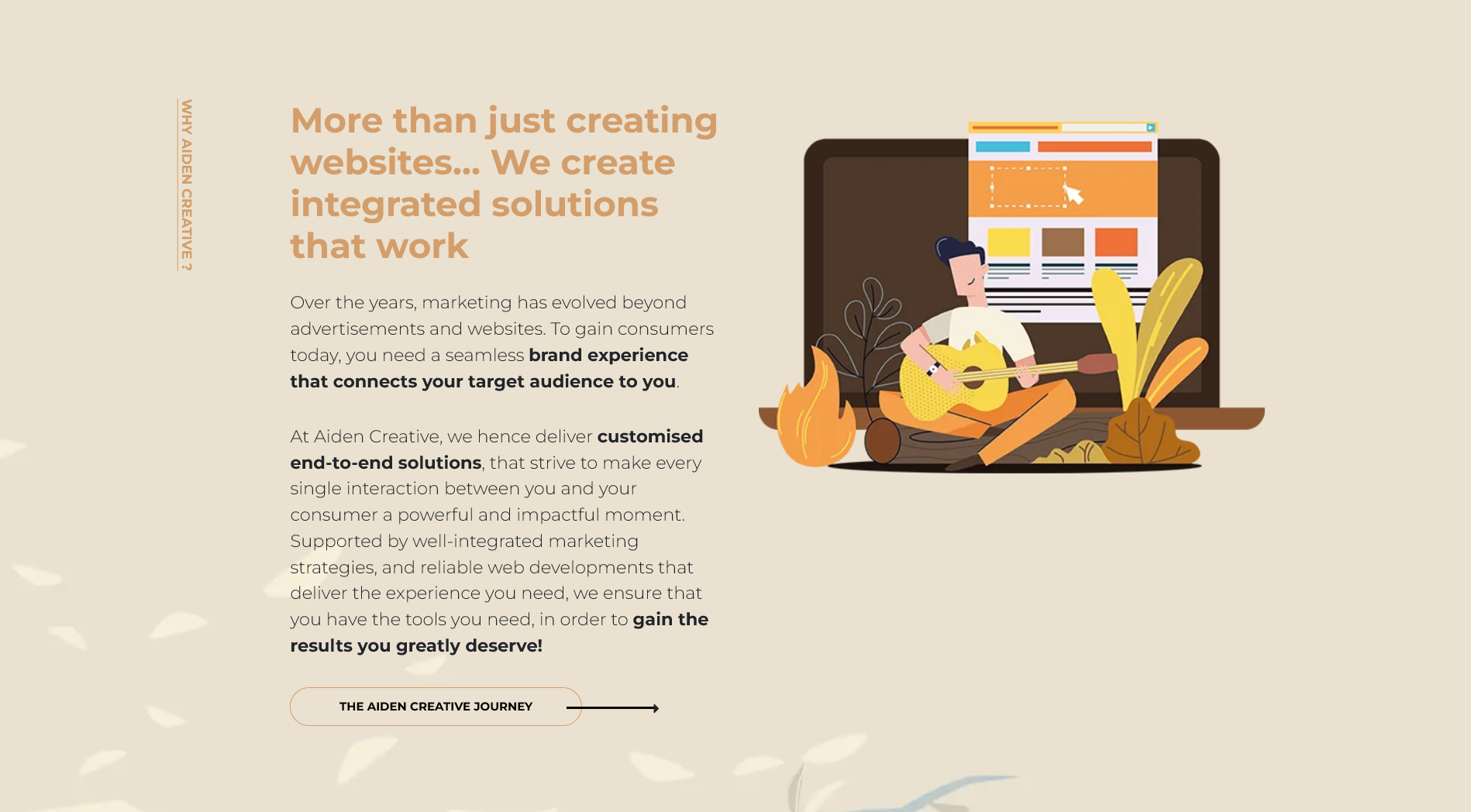 At Aiden Creative, we are a full-service digital marketing agency with over 13 years of experience delivering integrated marketing solutions. Our unique value proposition lies in providing a seamless brand experience through a combination of branding, content creation, digital marketing, and web and app development. We specialize in SEO, social media marketing, search engine marketing, and customer loyalty programs, helping businesses increase visibility and drive customer engagement. Our data-driven strategies enable us to craft targeted campaigns that enhance brand presence and maximize conversions. We have worked with leading companies across diverse industries, offering customized solutions that meet specific business objectives.