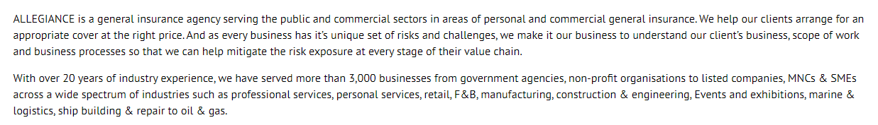 Allegiance is a top-rated insurance agency catering to public and commercial sectors, specialising in general and personal commercial insurance. We assist our clients in securing the right coverage at competitive prices. Acknowledging that every business encounters distinct risks and challenges, we are dedicated to understanding our clients' operations, scope of work, and business processes. This enables us to mitigate risk exposure at every stage of their value chain. Our expertise spans diverse industries, including personal and professional services, shipbuilding and repair, retail, F&B, marine and logistics, manufacturing, events and exhibitions, construction and engineering, and gas and oil.