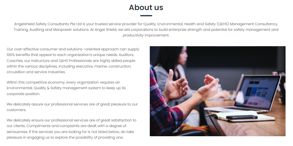 Angelshield Safety Consultants is your trusted partner for QEHS management consultancy, auditing, training, and workforce solutions. At Angelshield, we assist corporations in bolstering safety management and enhancing productivity. Our cost-effective, solutions-oriented approach is tailored to meet each organisation's unique organisation team of auditors, coaches, instructors, and QEHS professionals who have extensive expertise across a multitude of industries, including construction, marine, executive, and service sectors. In today's competitive economy, every organisation has a robust quality, safety, and environmental management system to maintain its edge. We are committed to delivering professional services that meet and exceed our clients' expectations.