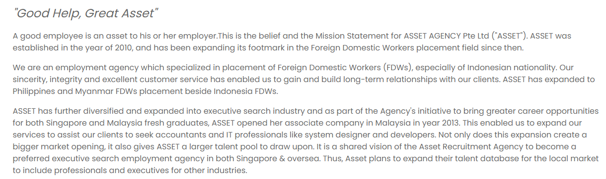A valuable employee is an asset to their employer—this principle drives the mission of Asset Agency Pte Ltd ("ASSET"). Since its establishment in 2010, ASSET has been a leading force in placing foreign domestic workers (FDWs) in the sector. We specialise in recruiting FDWs from Indonesia. Our integrity and exceptional customer service have fostered long-term relationships with our clients. Additionally, ASSET has expanded its services to include FDWs from Cambodia, Myanmar, and the Philippines. In 2009, Asset ventured into the executive search industry. Asset established an associate company in Malaysia to create more career opportunities for fresh graduates in Singapore and Malaysia in 2013. Our market reach expanded, and our talent pool increased.