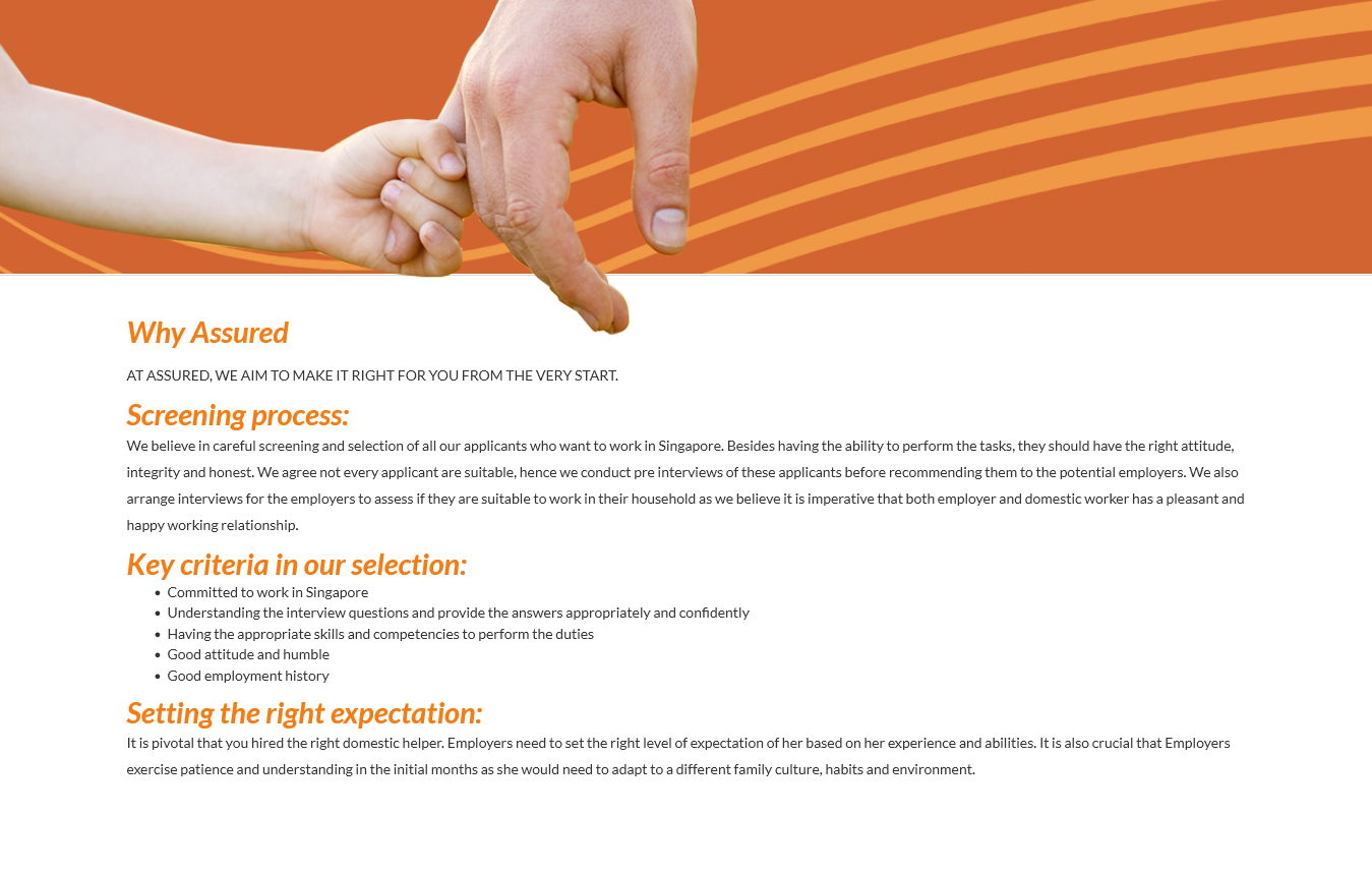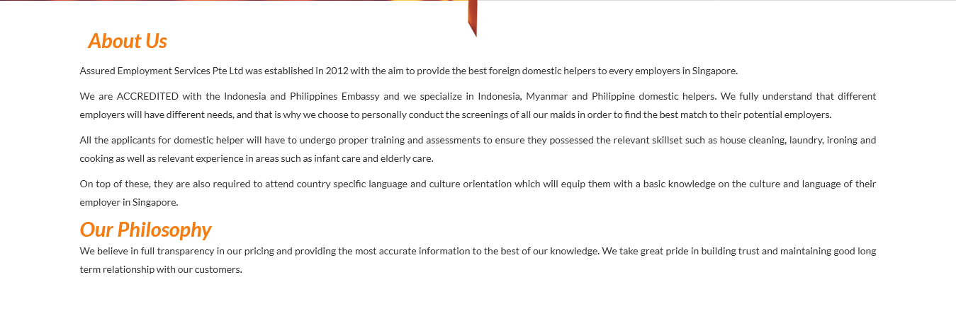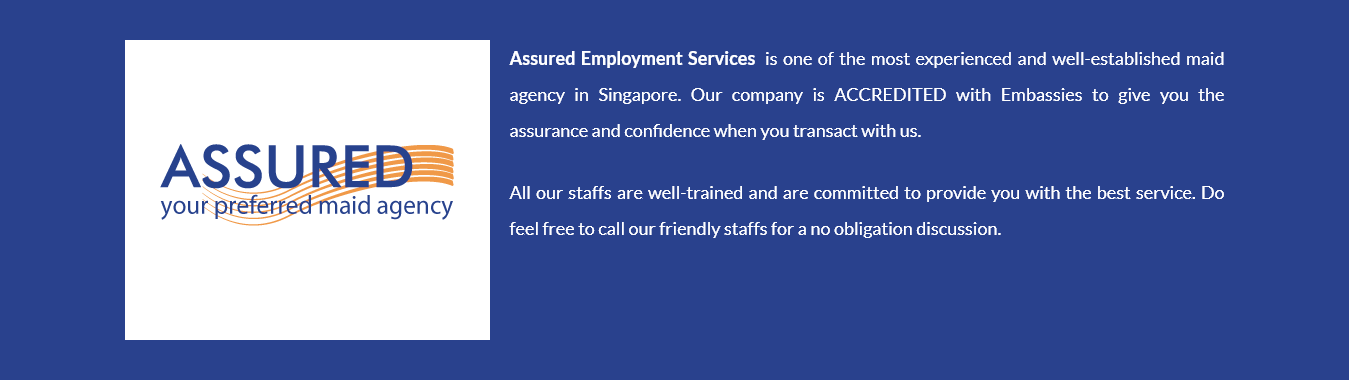 Assured Employment Services is a Singapore-based maid agency founded in 2012, dedicated to connecting families with reliable foreign domestic helpers from the Philippines, Indonesia, and Myanmar. We offer a full suite of services, including sourcing and direct hiring of helpers, transfer of existing helpers, work-permit and passport renewal, home-leave documentation, repatriation handling, and medical examinations. Our foundation is built on understanding each family’s unique needs, allowing us to match helpers with suitable skills and experiences. Over the years, we’ve earned trust through professionalism, transparent processes, and long-term support, consistently delivering satisfaction and peace of mind to employers.
