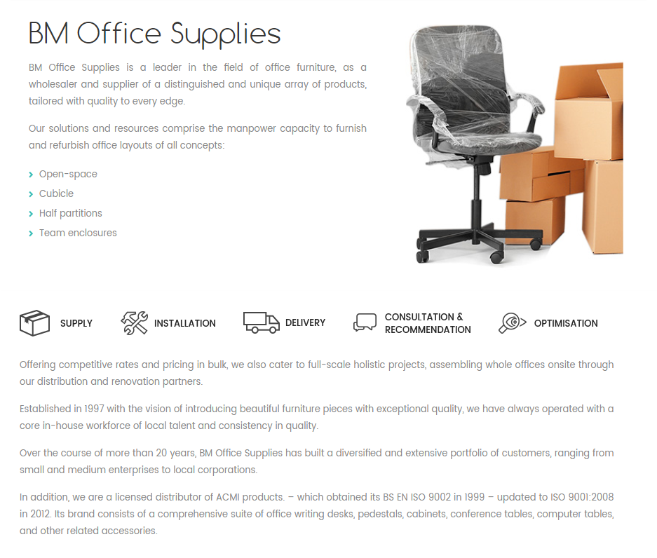 We give competitive rates and bulk pricing for holistic projects. With our partners, we can assemble entire offices onsite. Founded in 1997, we aim to introduce beautiful, high-quality furniture. We have always relied on a core in-house workforce of local talent. For over twenty years, BM Office Supplies has served a diverse range of small and medium enterprises, as well as local corporations.