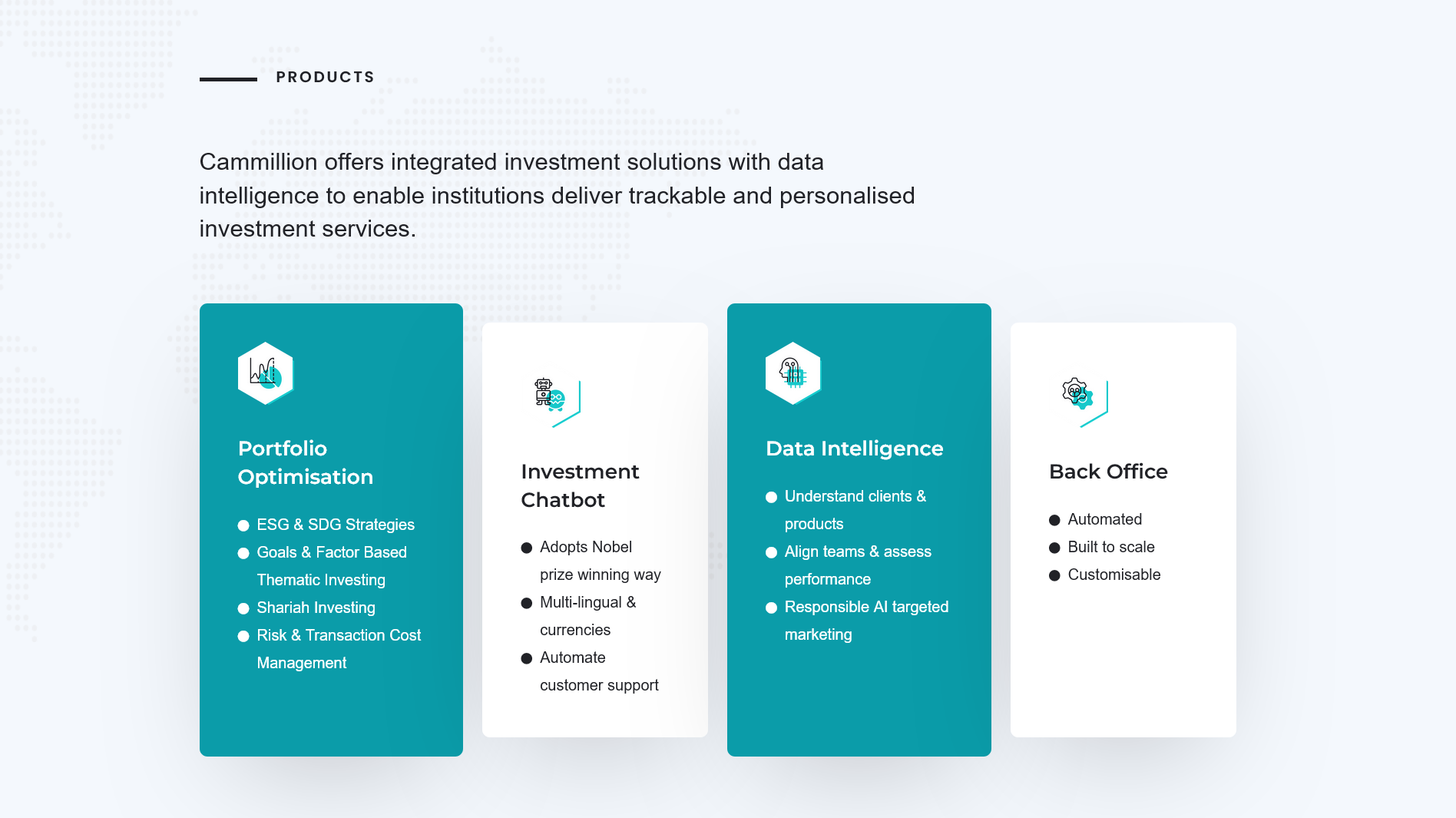 Our core offering at Cammillion is delivering adaptive, personalised investment advisory solutions that empower financial institutions, brokers, and fund managers to enhance client outcomes without inflating headcount or operational complexity. Founded in 2017 with roots in Penang and Singapore, we combine Cambridge-powered R&D with industry expertise. Our platform enables rapid deployment of digital investing experiences, complete with sustainable and thematic strategies, back-testing capabilities, and low-cost customisation. By offering sophisticated analytics, automated portfolio management, and scalable tools, we help firms modernise operations, deepen client engagement, and remain at the forefront of digital wealth management.