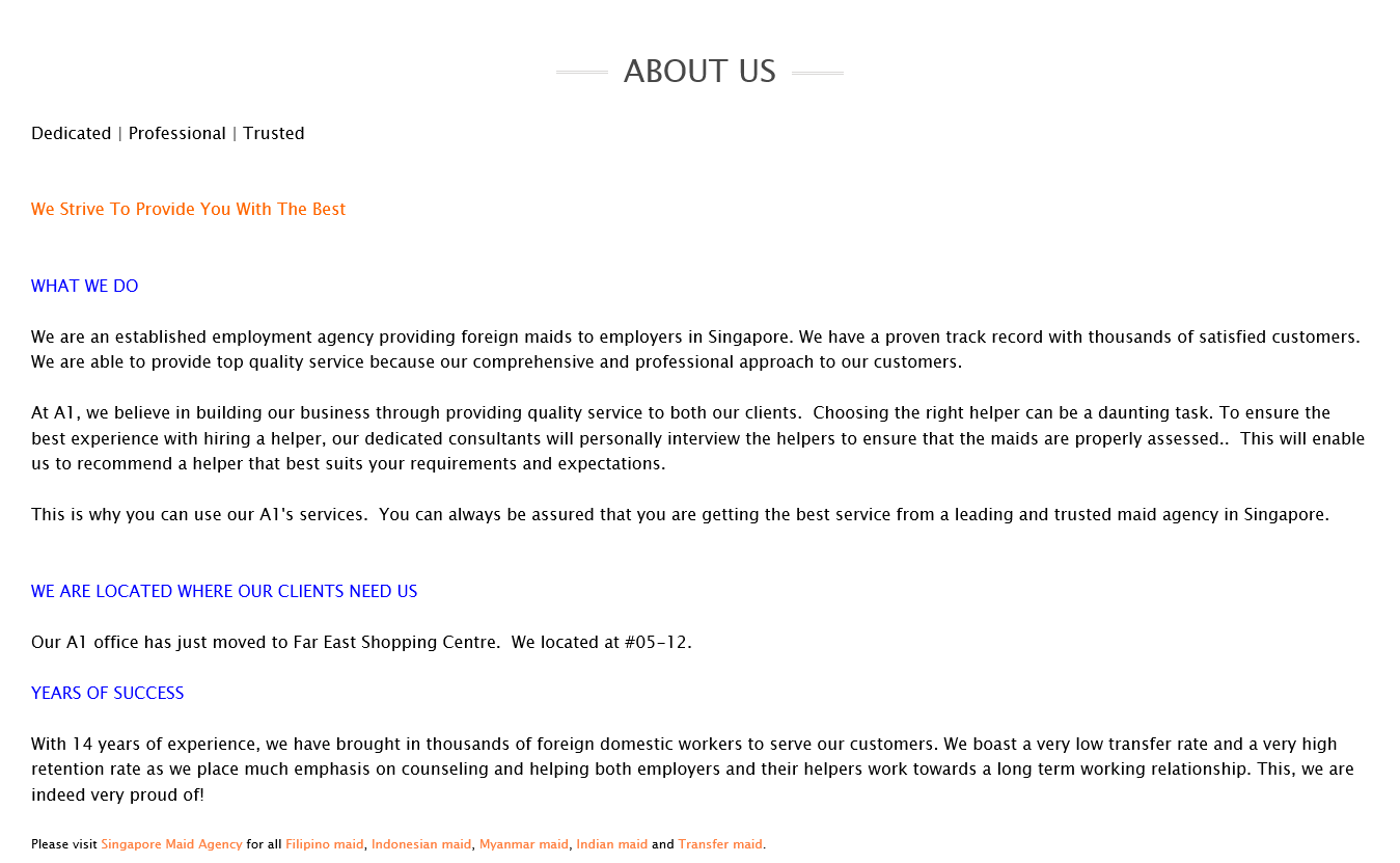We are Singapore's leading foreign maid employment agency with a successful history and thousands of satisfied customers. From our comprehensive and professional approach to customer service, you can expect nothing but top-notch quality from us.