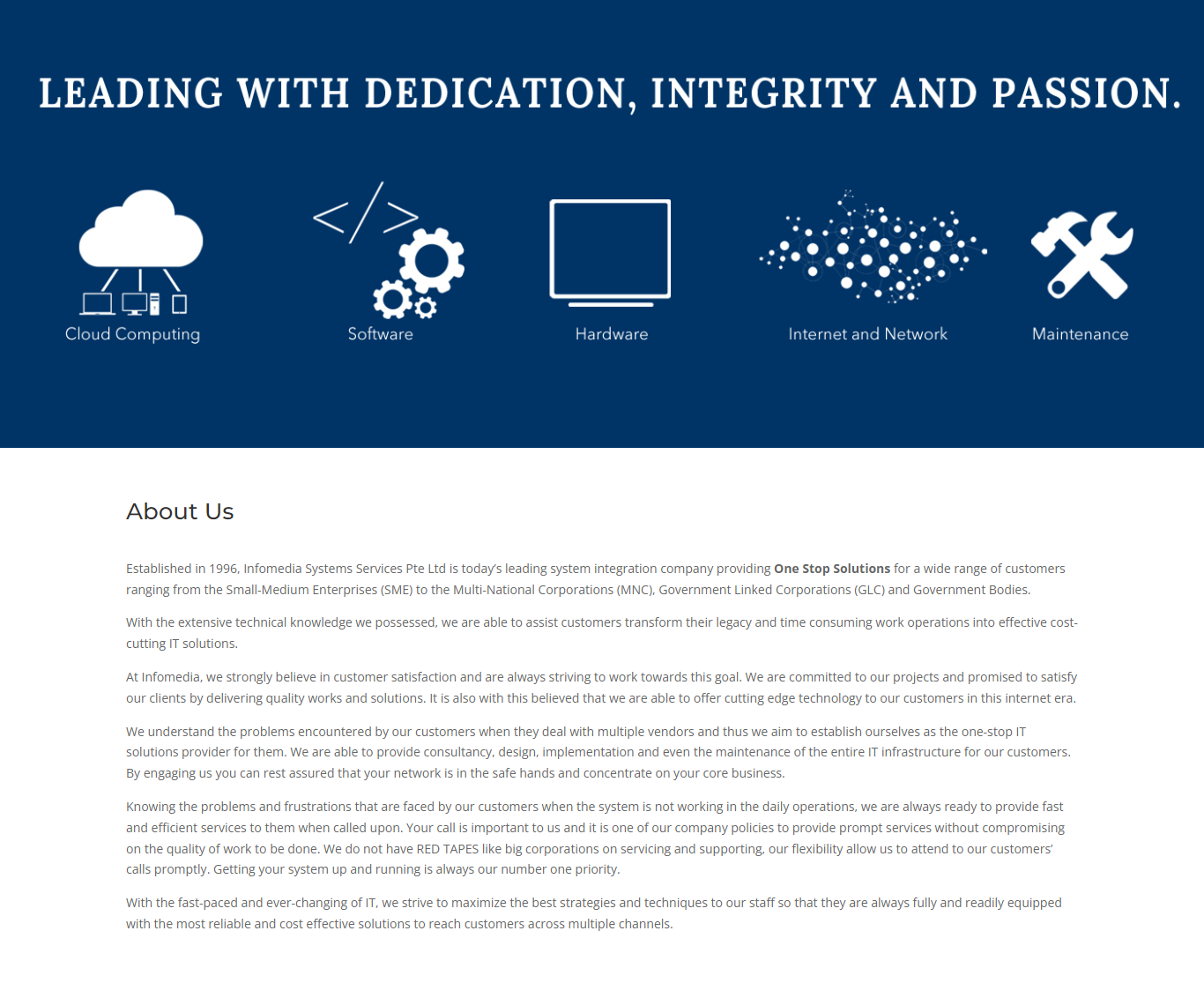 Established in 1996, Infomedia Systems Services is a leading system integration company offering solutions for clients ranging from SMEs to MNCs, GLCs, and government bodies. With deep technical expertise, we transform legacy operations into cost-effective IT solutions. Customer satisfaction is our priority at Infomedia. We deliver quality work and innovative solutions, serving as a one-stop IT provider for IT infrastructure consultancy, design, implementation, and maintenance.