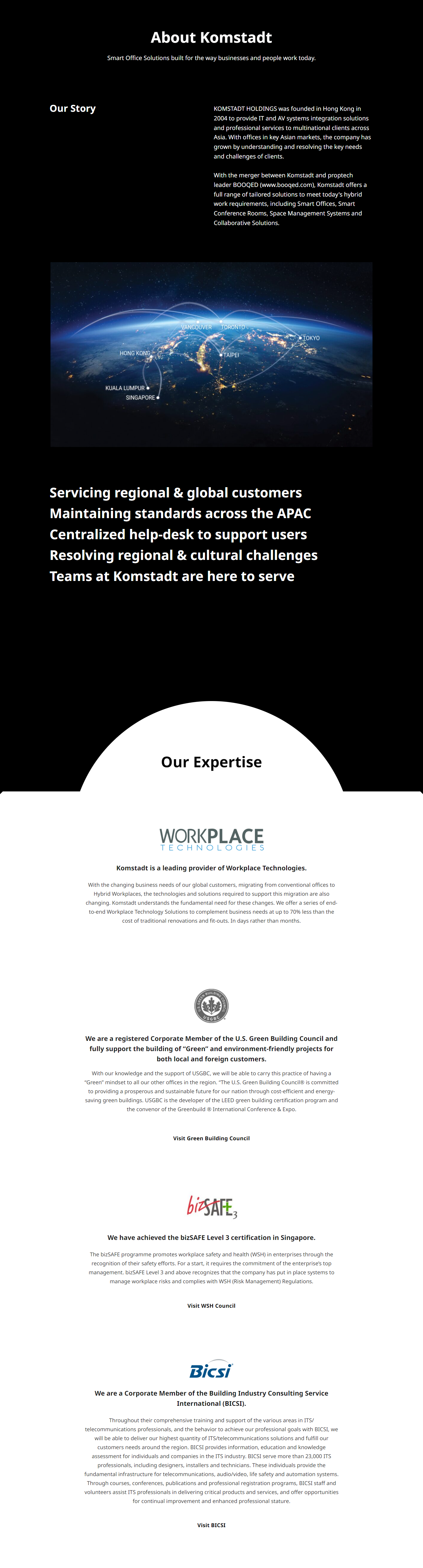 Founded in Hong Kong in 2004, Komstadt Holdings specialises in delivering IT and AV systems integration solutions and professional services to multinational clients throughout Asia. With offices in major Asian markets, the company has expanded by understanding and addressing its clients' critical needs and challenges. Following the merger with prop-tech leader BOOQED (www.booqed.com), Komstadt now provides a comprehensive array of customised solutions designed to meet the demands of today's hybrid work environments. These offerings include intelligent conference rooms, space management systems, smart offices, and collaborative solutions.
