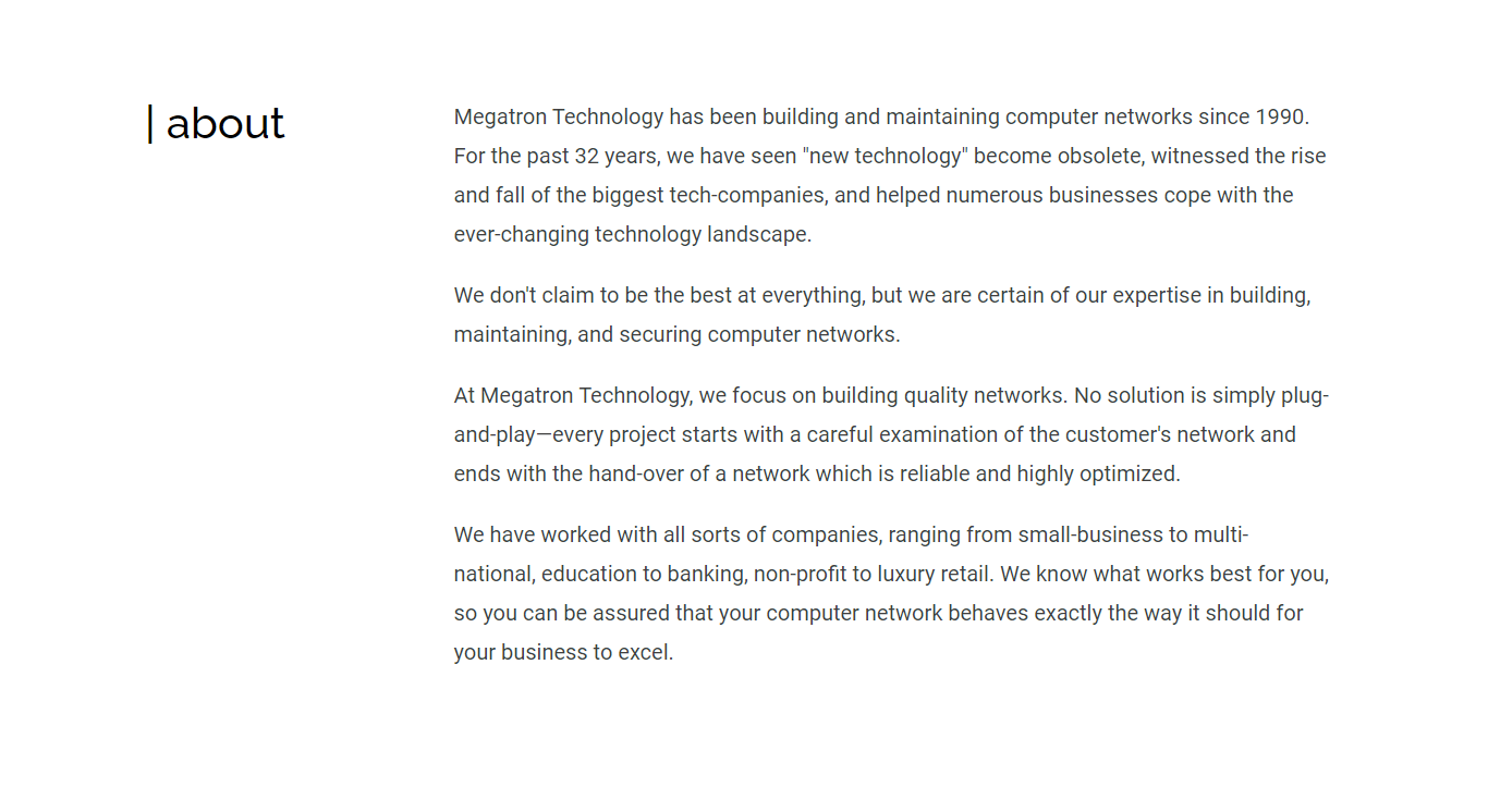 At Megatron Technology, our mission is to empower businesses by providing top-tier IT support and scalable network solutions. We focus on helping companies manage their IT infrastructure with ease, so they can concentrate on growing their core business. Our services include designing, building, and maintaining computer networks for businesses across Singapore and Malaysia, catering to a wide range of industries, from education to logistics and retail. We are committed to ongoing training and industry certifications to keep our team updated with the latest technological advancements. This focus on continuous learning enables us to deliver innovative and reliable solutions to our clients.