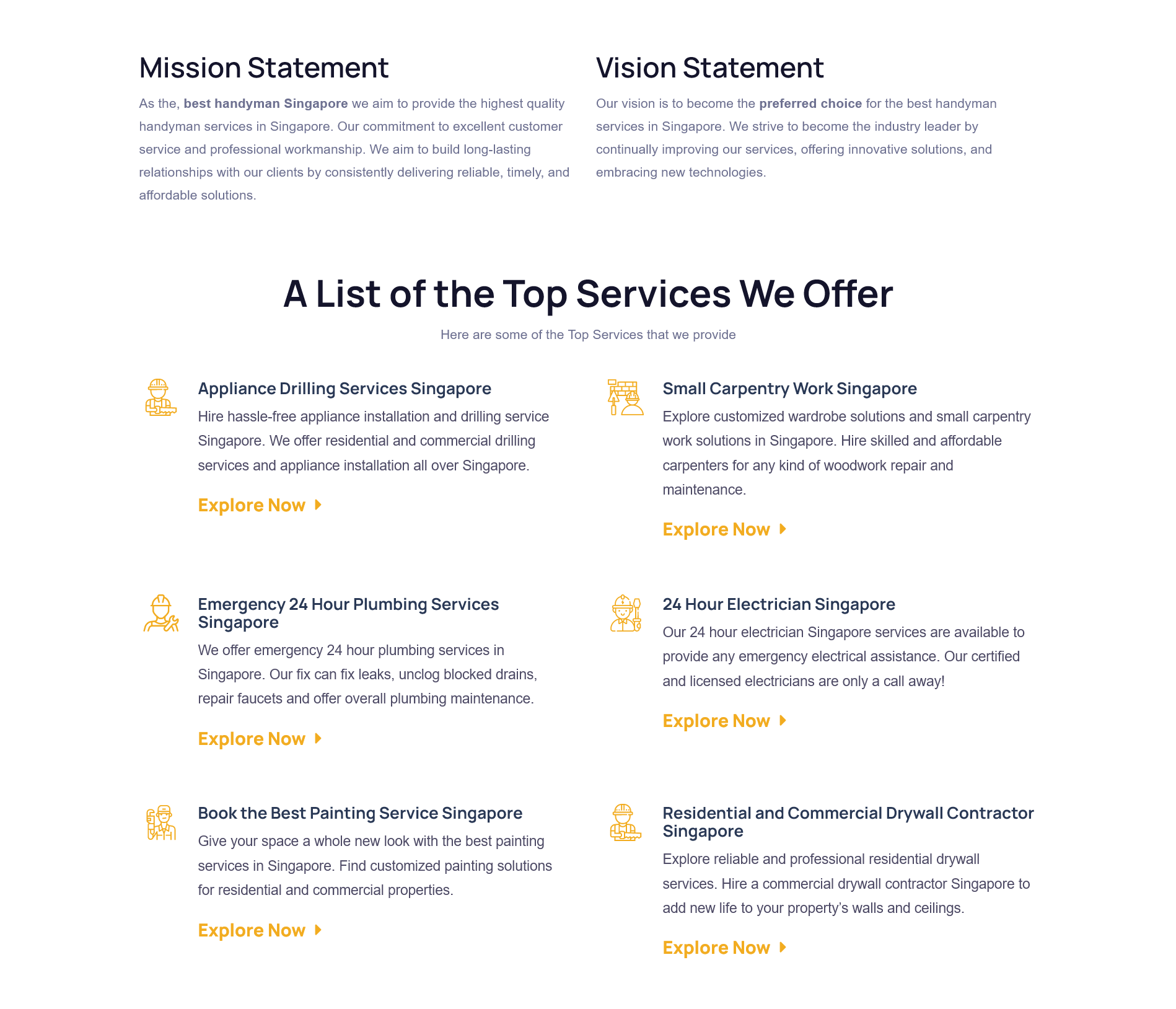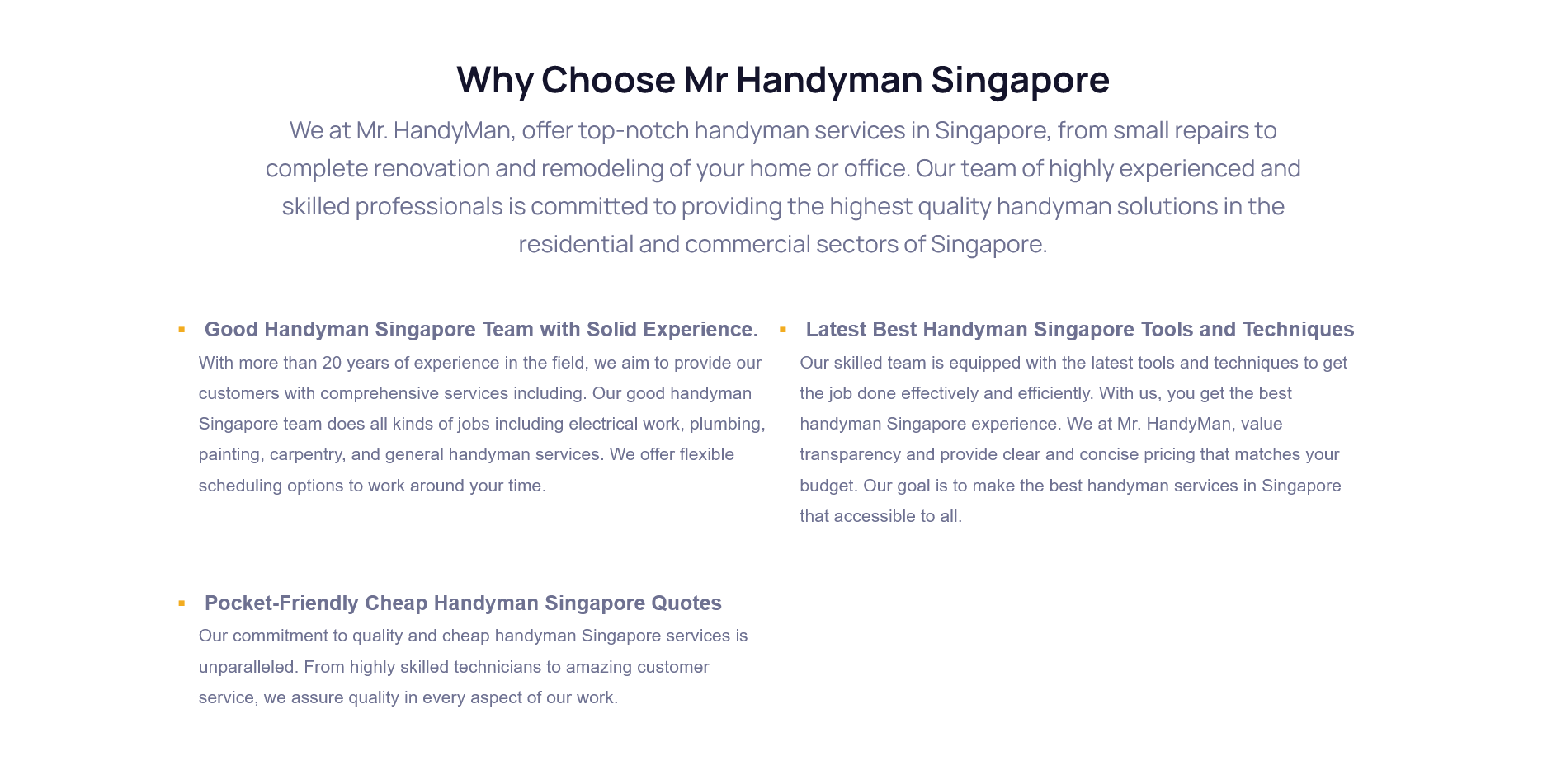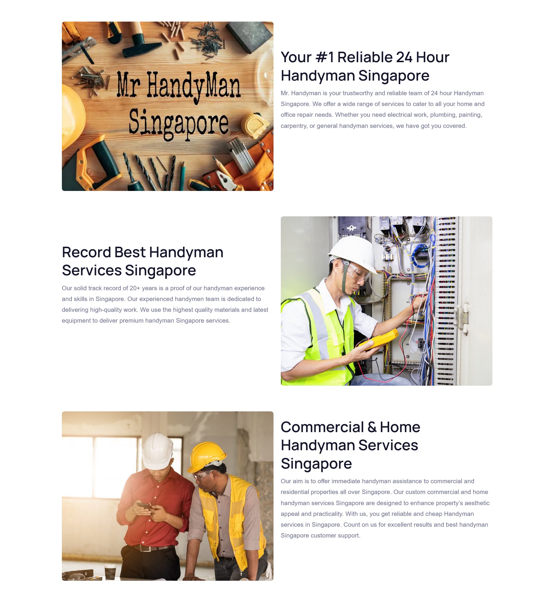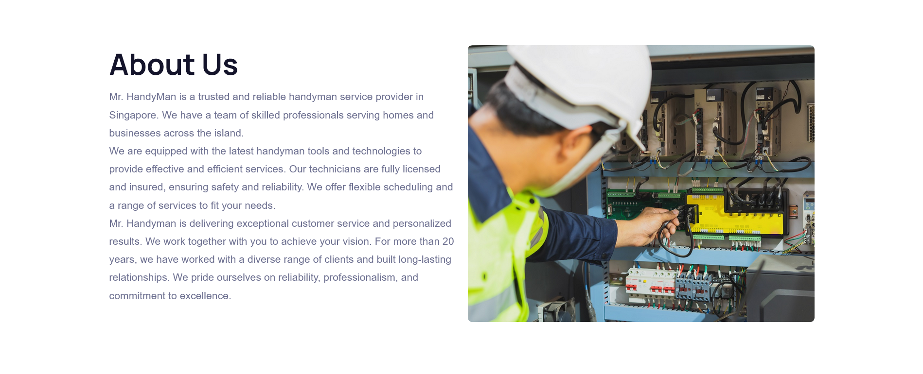 At Mr. HandyMan Singapore, our primary goal is to provide fast, reliable, and affordable handyman services to meet all your home repair, installation, and maintenance needs. With over 20 years of experience and a commitment to client satisfaction, we offer a comprehensive range of services, including plumbing, electrical work, carpentry, painting, and furniture assembly.