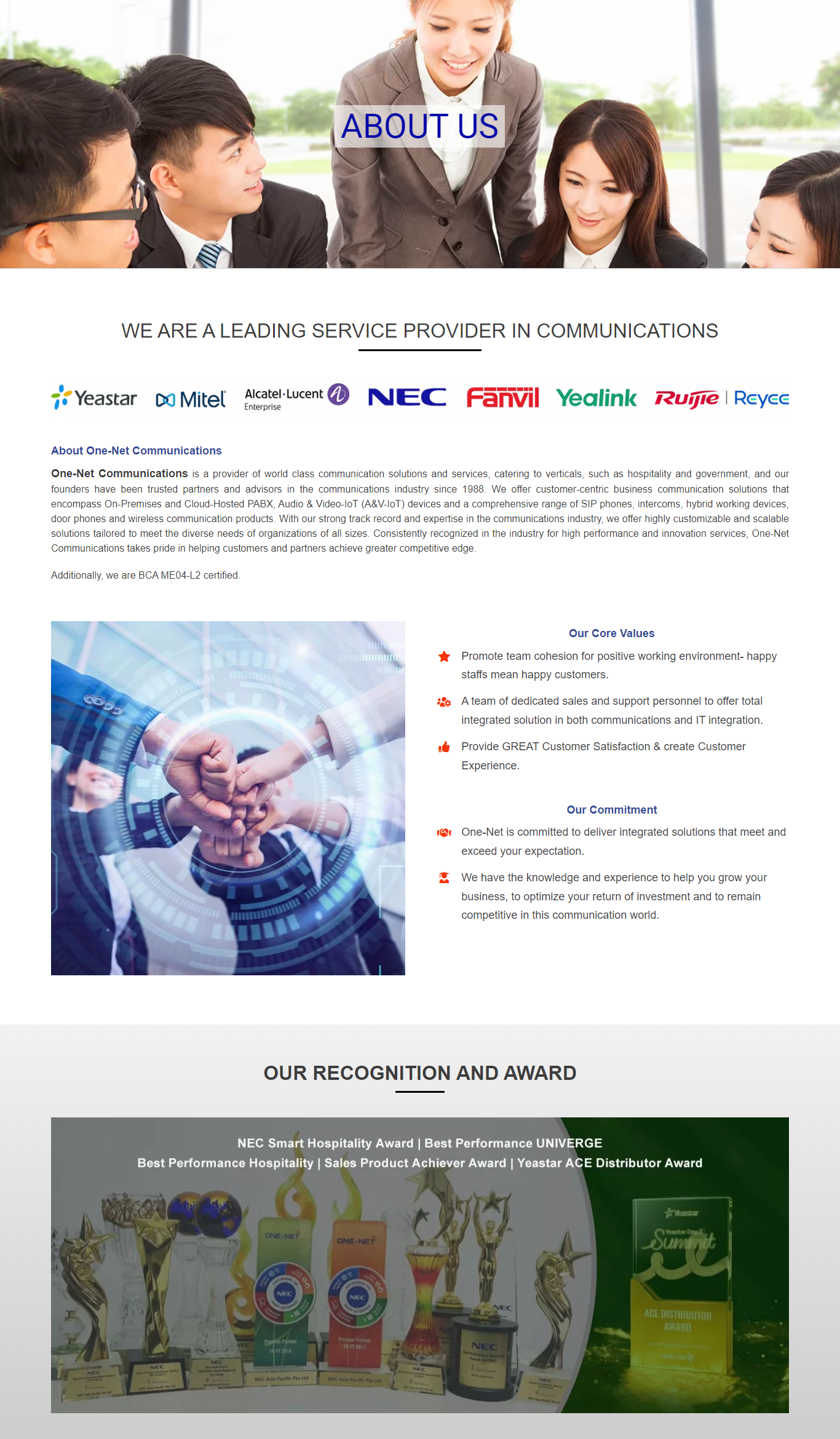 One-Net Communications is a leading provider of world-class communication solutions and services, serving industries such as hospitality and government. Our founders have established themselves as trusted partners and advisors in the communications sector since 1988. We deliver customer-centric business communication solutions featuring both on-premises and cloud-hosted PABX systems and a diverse array of Audio & Video (A&V-IoT) devices. With a proven track record and deep expertise in the communications industry, we provide highly customisable and scalable solutions designed to meet the diverse needs of organisations of all sizes.