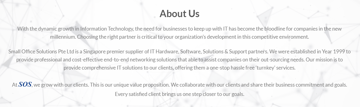 As information technology rapidly evolves, staying current has become critical for businesses in the new millennium. Selecting the right partner is crucial for your organisation's growth in this competitive landscape. Small Office Solutions Pte Ltd, established in 1999, is a notable IT hardware, solutions, software, and support provider in Singapore. We specialise in delivering professional, cost-effective end-to-end networking solutions for companies' outsourcing needs. Our mission is to provide comprehensive IT solutions, offering clients seamless, one-stop turnkey service. At SOS, we thrive with our clients, embracing a unique value proposition. Through collaboration, we share their commitment and business objectives.