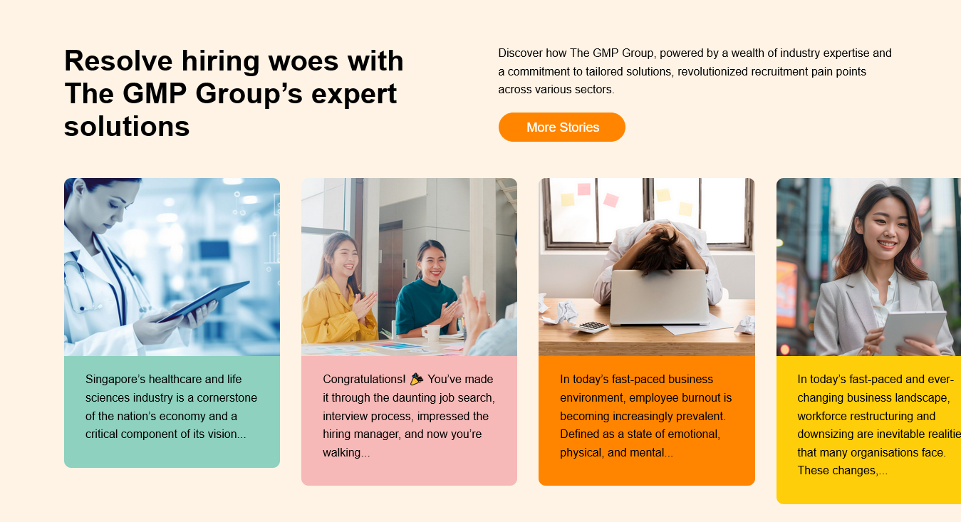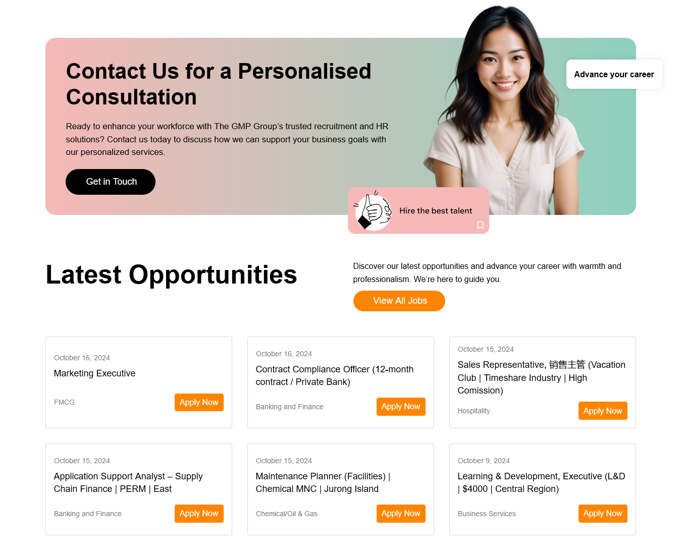The GMP Group is a leading recruitment and human resource solutions provider based in Singapore. With over 30 years of industry expertise, we provide tailored solutions for connecting top-tier talent with businesses across various sectors, ensuring the right fit for both employers and job seekers. Our services encompass executive search, general recruitment, contract staffing, and HR consultancy, tailored to meet evolving market demands. As a trusted partner in workforce solutions, we are committed to upholding excellence, integrity, and professionalism. Our extensive network and industry insights allow us to support businesses in building high-performing teams while helping professionals advance their careers.